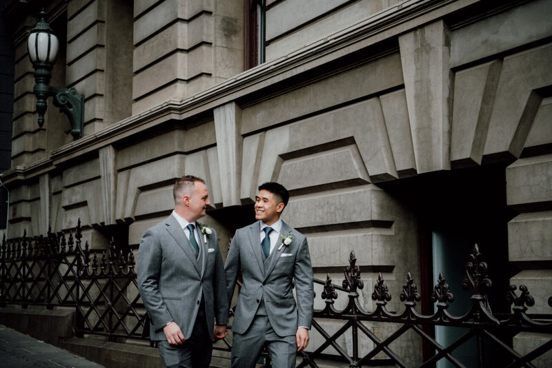We met in Fitzroy Gardens for pre-ceremony photoshoot. They brought their puppies Paris and Rhys, and we had a lot of fun there, walking around and taking photos. Then we drove to city and on the way from parking to Melbourne Town Hall we stooped by different hidden corners and took a lot of candid photos - guys was very camera shy, but at the end they said that even didn't feel that the've been photographed.